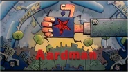 Visuals: The logo begins by cutting to a full view of a scenery that is made up of different shaped gears that rotate in different directions. The camera slowly zooms towards a blue square with a red Aardman star on it that has little gears inside. The square has a small head, arms and legs, and is running on a green gear that operates the scenery. The green gear has copies of the third, fourth, fifth and seventh letters of “Aardman” in red and green, whilst the other letters in red spin around in different directions on sticks behind a teal gear with a smaller green gear in front of it. The background behind the square consists of three light blue gears and a yellow gear with clouds attached on with sticks, and green anamorphic planes flying around in either direction on sticks. It has two brown gears with trees on, dark blue gears that have houses on, and dark green gears that have three different types of cartoony cars. The rest of the scenery have brown gears with different houses and buildings, teal gears that have cartoony people, and green hands performing finger counting gestures. As the camera reaches its position, a human hand reaches out from the right and grabs hold of the square. The thumb presses the head like a stopwatch which freezes the scenery in place and the letters form "Aardman" below.
