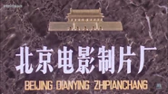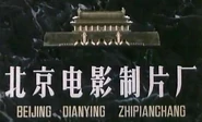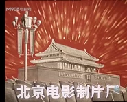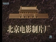 Logo: On a red sunburst background, we see a golden model of the Tiananmen Square with some street lights and the ground. Underneath, "BEIJING FILM STUDIO" in Chinese on the bottom.