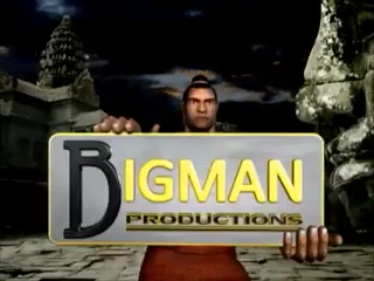 Logo: Inside a temple of ruins (which looks similar to the Angkor Wat temple), there is a muscular, shirtless tribesman carrying the company's logo (which consists of a grey rectangle with the golden words "BIGMAN" and "PRODUCTIONS" with a line below "PRODUCTIONS" while the "B" itself is colored black and is large to the left) on his shoulder while walking to the left. The screen then cuts to a black clouds time-lapse, with the shot changing to a different shot of the temple with the man walking towards the camera. Then, his feet is seen to stopped walking as the man takes the logo off his shoulder, let his other hand hold the logo, and quickly waves it up and down before showing the camera the company's name. Finally, there is a flash that transitions the shot to white and then fades to black.