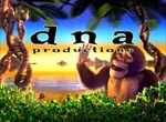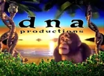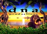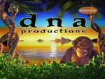 Logo: On a tropical background complete with a beach, and a sunset, we see the black, lowercase text "d n a productions" with "d n a" bigger and spaced and "productions" underneath, near the top of the screen, and two double helix coconut trees twisting behind a bush. A monkey jumps up from behind the trees with his back turned to us. Then, he turns around, revealing that he has a parietal eye, and waves at us, saying "Hi, I'm Paul!"