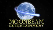 Logo: On a zooming and cloudy space, there is a blue comet that enlights the moon and passes, just like the previous logo. The background ends up in a box and "MOONBEAM F I L M S", in a stacked gold font, zooms out and places itself below the moon.