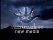 Logo: On a black background, a wave of electricity appears in the shape of the Rainmaker hand symbol. All of a sudden, a new background (a mountainous landscape with a very cloudy sky and rain) and the outlines that form the Rainmaker symbol appear. The spiral inside the symbol then shoots out lightning which forms the Rainmaker text in the same font as before (albeit less spaced out and larger), along with "new media" in an Arial font below it. After forming the text, the lightning goes back to the left of the Rainmaker text before it disappears. The finished product then stays for a bit before fading out.