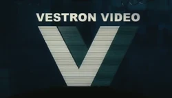 Logo: The logo starts off with the same effects as the second logo. However, the screen then zooms out, revealing the lines on a circular table in the teal-lit factory. Machines then carve out a V. They then place the text "VESTRON", now in an Arial Black font, which shrinks to make way for the word "VIDEO". The logo flashes. Once the fanfare is over, the logo quickly fades out and cuts back to the logo, gets static-shocked and cuts to black.