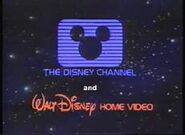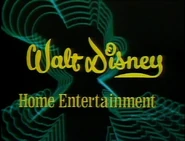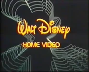 Logo: A flash occurs. The face of Mickey Mouse in his then current drawing style zooms in, which quickly turns neon, then we see brief clips from Disney films and shorts such as Steamboat Willie, Snow White, Pinocchio, Fantasia, Bambi, Alice in Wonderland, Zorro, Old Yeller, Treasure Island, The Country Bear Jamboree, and The Absent Minded Professor. Donald Duck's neon head zooms in, then a wall of light appears, Mary Poppins floats down with her parasol, then Tinkerbell flies up with sparkles forming. We see a picture of a neon castle with fireworks in the background. We zoom into it, then we zoom in to a vector-like rendition of Epcot. Afterward, we go to a black/dark red gradient background. The "WALT DiSNEY" text zooms up from the top, then "HOME VIDEO", also in blue, appears below, cheaply inserted. The whole thing sparkles and glows a little bit.