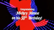 - On some, if not all, of Disney's 1978 theatrical releases, this logo appeared as a solid red Mickey with purple dashed outlines surrounding it, rotating a bit faster than the home video variant. The text "Congratulating Mickey Mouse on his 50th Birthday!", in white and in a fancy font, zooms in. After a few seconds, it zooms in towards the screen until vanishing from sight, and the top and bottom halves of the 1978 "Stripes" variant of the Buena Vista logo are wiped in over the logo, opening the film. Three films known to have this special introduction are Hot Lead and Cold Feet, The Cat from Outer Space and Return to Witch Mountain (it is intact on current releases of The Cat from Outer Space without the music but the Anchor Bay DVD doesn't have it; while the soundtrack for Return to Witch Mountain has the music that would've played over it, but it doesn't appear on current releases of the film).